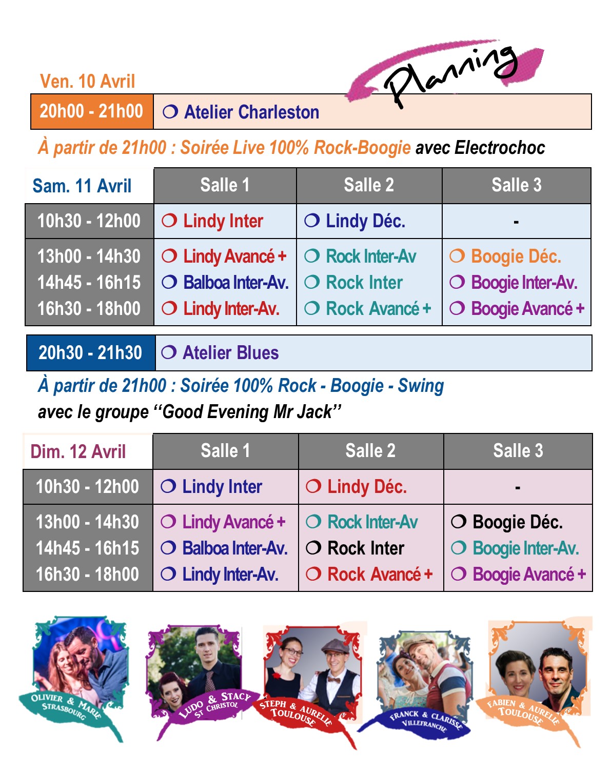 Par exemple le Module Rock inter comprend les 2 cours de Rock inter (samedi après-midi à 13h00 + dimanche après-midi à 13h00) et la soirée du Samedi avec le cours de Blues - Pass 2