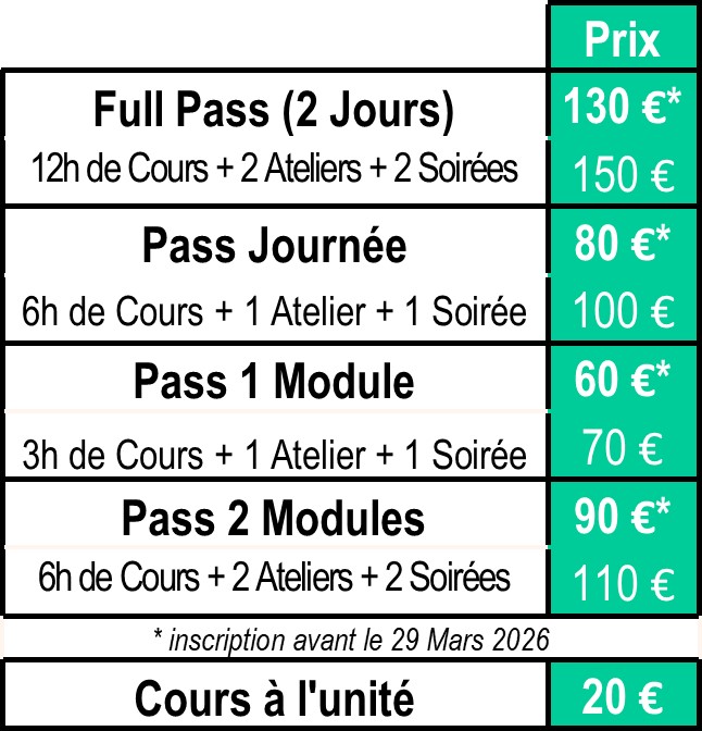 - Le FULL PASS (Week-end Complet) comprend tous les cours du week-end (Samedi et Dimanche) + l'entrée aux 2 soirées + les 2 Ateliers (Blues & Charleston)